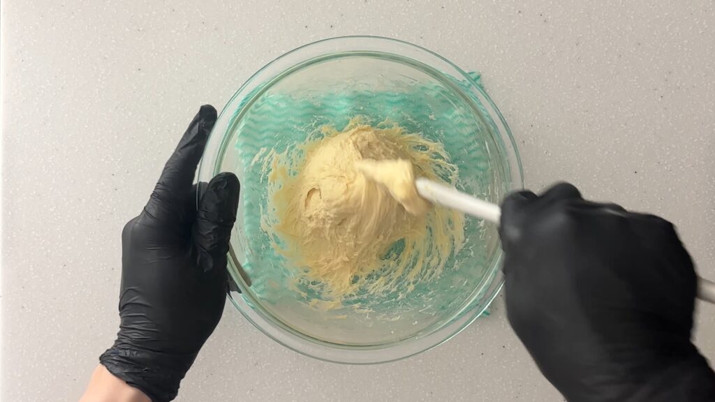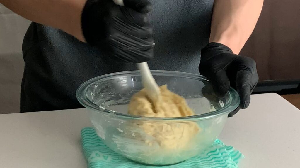 生地をゴムベラに差し込み、100回転だけ練りまわす。