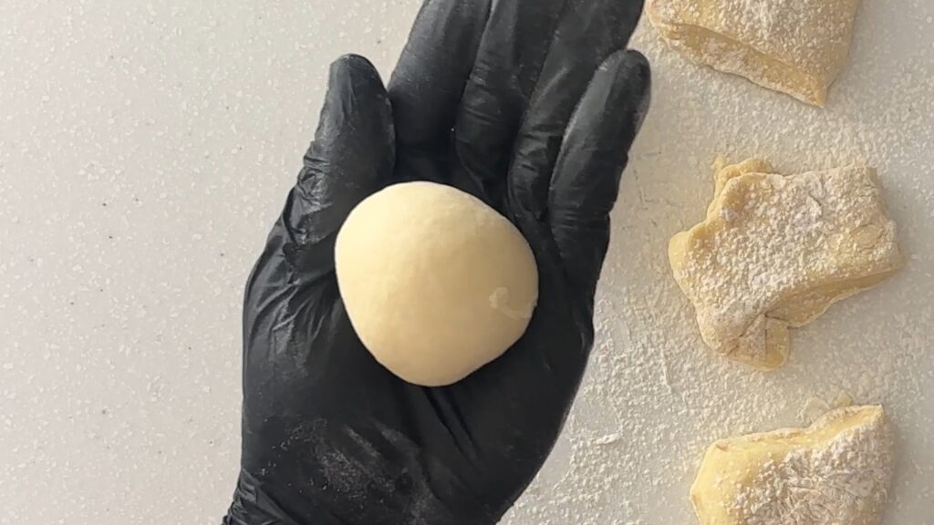 手のひらで生地をかるく押さえて平らにして、丸めなおす。