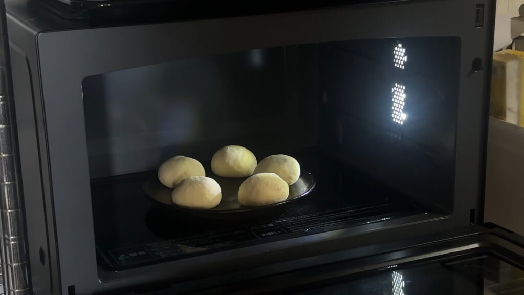 ※夏場など室温が高い場合、作業中に生地温度があまり下がらないため発酵モードは40℃以下で調整しましょう。また、レンジ加熱も短くしたほうが良い場合もあります。目安は加熱後に生地の底面を触って人肌程度の温かさを感じられる状態がベストです。お風呂程度の熱さになると加熱しすぎです。