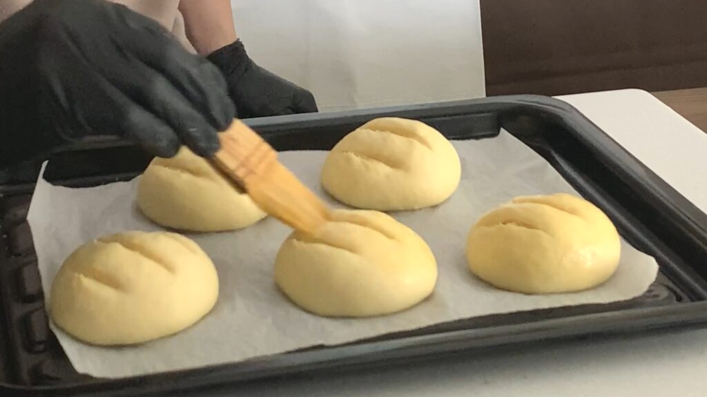 計量時に余った溶き卵を生地表面に薄く塗り、切り込みに油を少量垂らす。