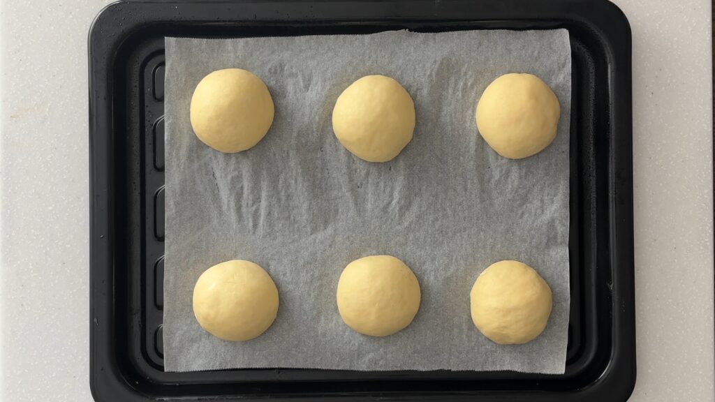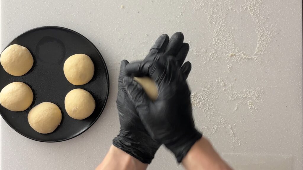 手のひらで生地をかるく押さえて平らにして、丸めなおす。