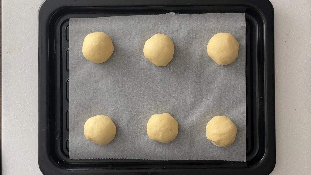ベタつかないように手粉を適宜ふりかけ、生地を6等分にする。